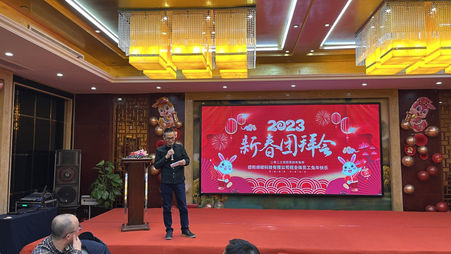 奮斗的時(shí)光總是轉(zhuǎn)瞬即逝,驀然回首已是歲末1月16日下午, 德陽烯碳科技有限公司攜下屬子公司在凱拂菻大飯店隆重舉行了 “2023年烯碳集團(tuán)新春團(tuán)拜會”,共同分享一年來的辛勤和收獲,暢談新一年的美好與憧憬。德陽烯碳科技有限公司、德陽中碳新材料科技有限公司、四川卡柏萊尼科技有限公司、四川依菲蘭科技有限公司、四川烯材科技有限公司以及四川科米維暖通設(shè)備銷售有限公司全體員工,歡聚一堂,共迎新春。董事長郭安賢、總裁肖輝繼分別出席團(tuán)拜會并致辭。
